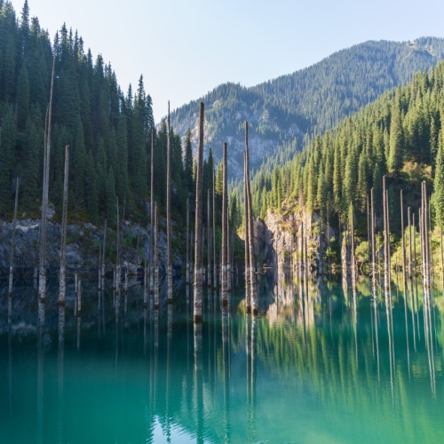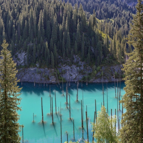 에메랄드빛 물속에 나무가 잠겨 있는 신비로운 카인디 호수